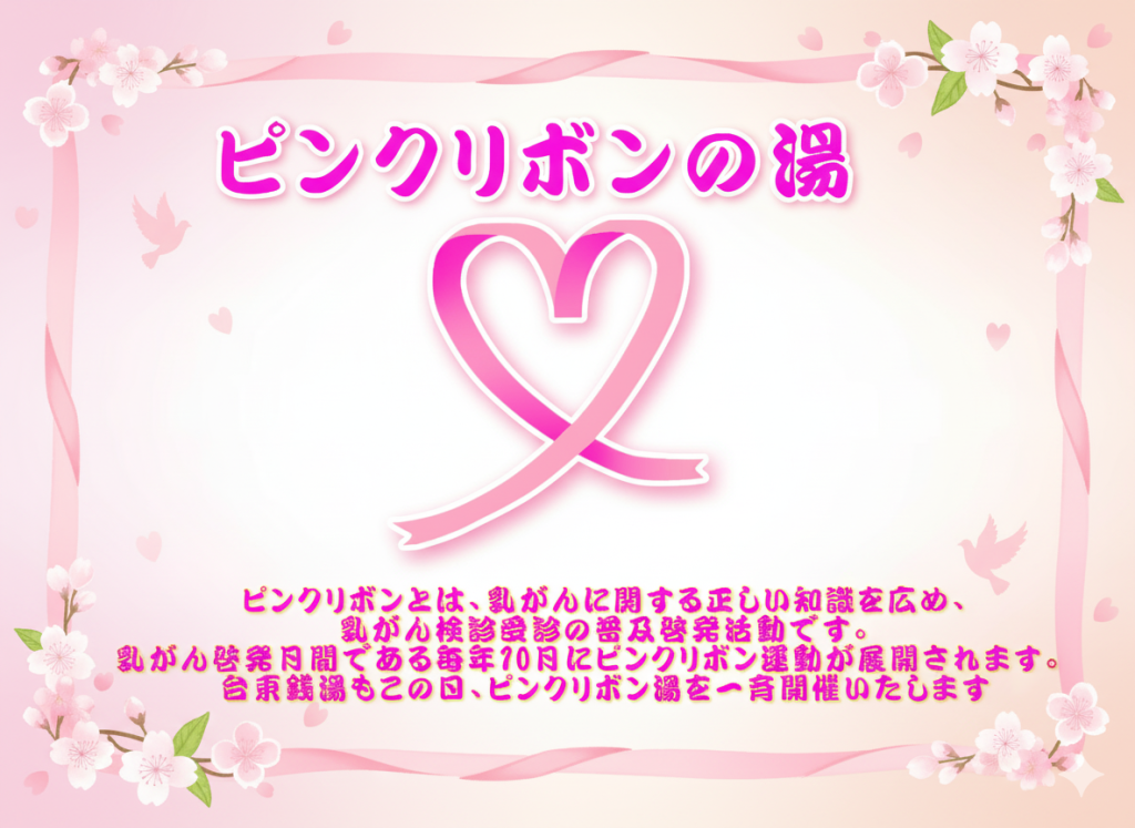 乳がん啓発月間である毎年10月にピンクリボン運動が展開されます。 台東銭湯もこの日、ピンクリボン湯を“一斉開催”いたします💓