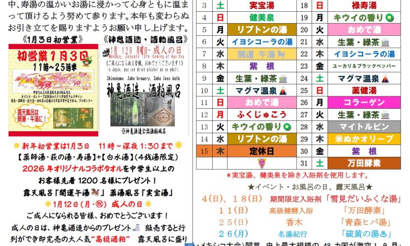 1月3日 新年初営業は、中学生以上のお客様先着1200名のお客様に、「寿湯・薬師湯・萩の湯・白水湯、4銭湯限定オリジナルタオルプレゼント」