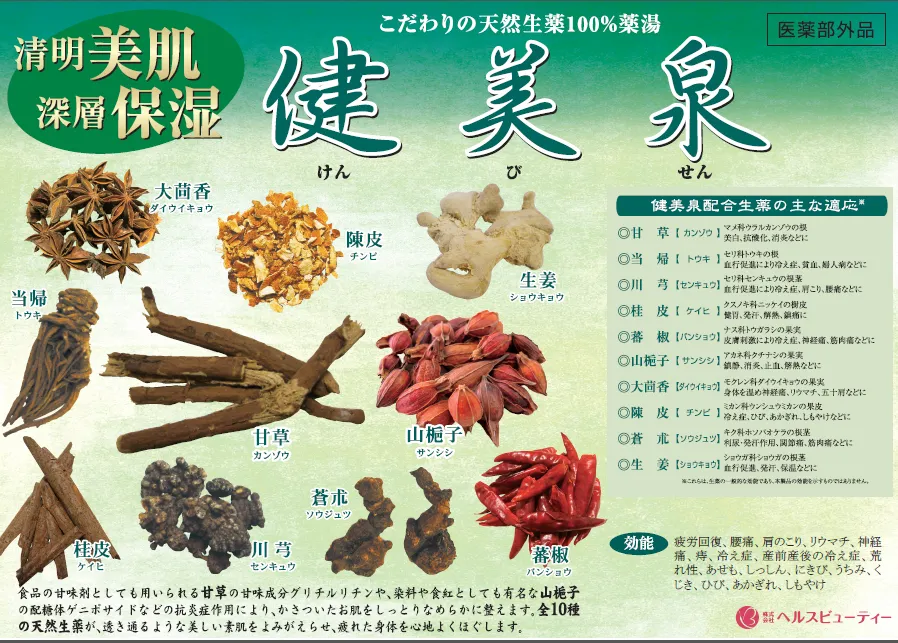 刻んだ生薬を古来の伝統に基づき独自ブレンドした、本格薬湯です。カンゾウをはじめとした全10種の生薬から、濃厚なエキスがお湯に広がります。